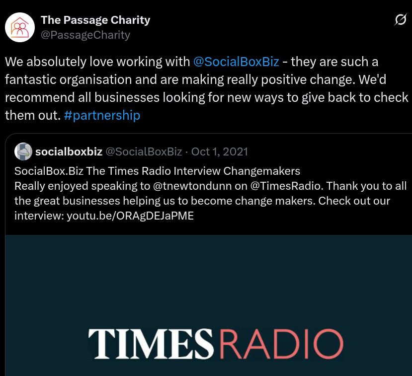 The Passage A blog post celebrating a long-term partnership with The Passage, a trusted homelessness charity. https://passage.org.uk/socialbox-biz-and-the-passage-celebrate-7-years-of-giving/