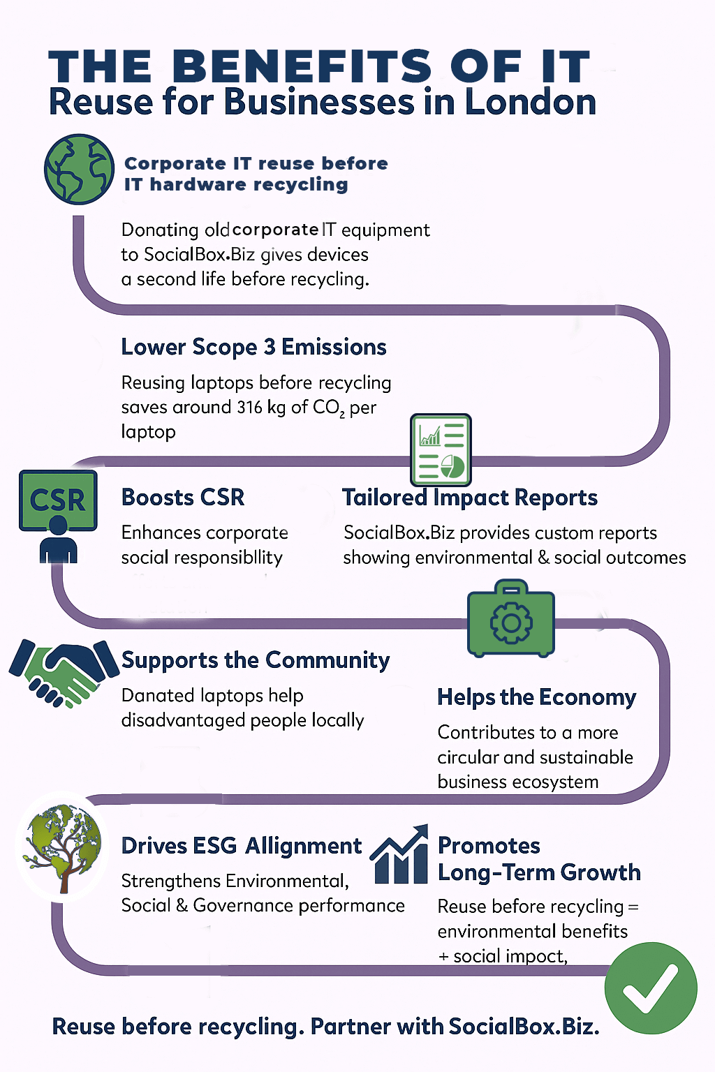 SocialBox.Biz empowers London businesses to look beyond just IT disposal and computer recycling by prioritizing the secure reuse of functional IT equipment. This transforms routine asset disposal into a powerful corporate impact story that boosts a company’s Environmental, Social, and Governance (ESG) performance and Corporate Social Responsibility (CSR).