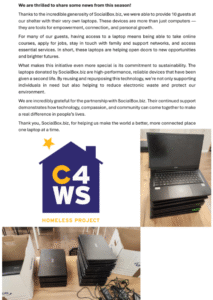 The partnership between SocialBox.Biz and C4WS Homeless Project has proven to be a fruitful helping connect a long list of people in need with updated old tech while reducing emissions for corporate partners and providing a solution for their social impact problems.